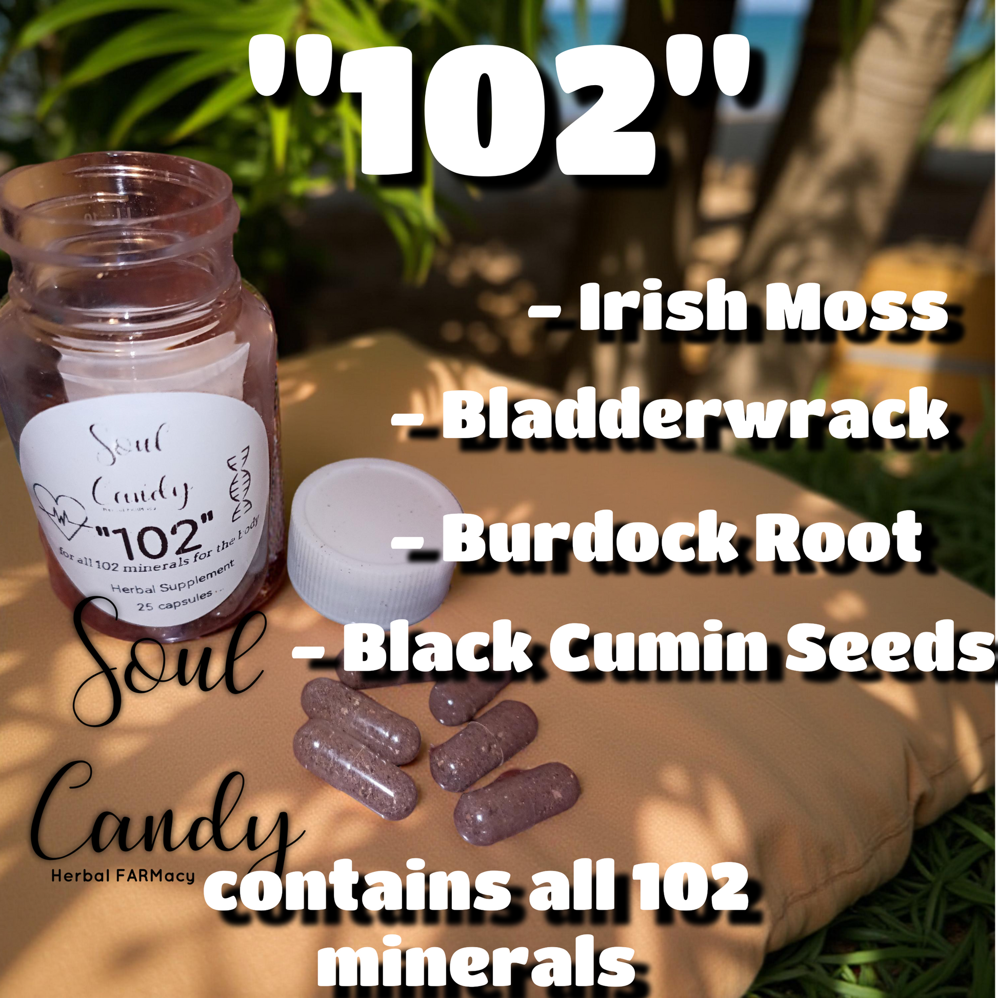 Our "102" capsules contains over 88 of the 102 minerals that our body is compromised of. This supplement consists of four powerhouse herbs. This supplement is ideal for overall health maintenance. May help with: