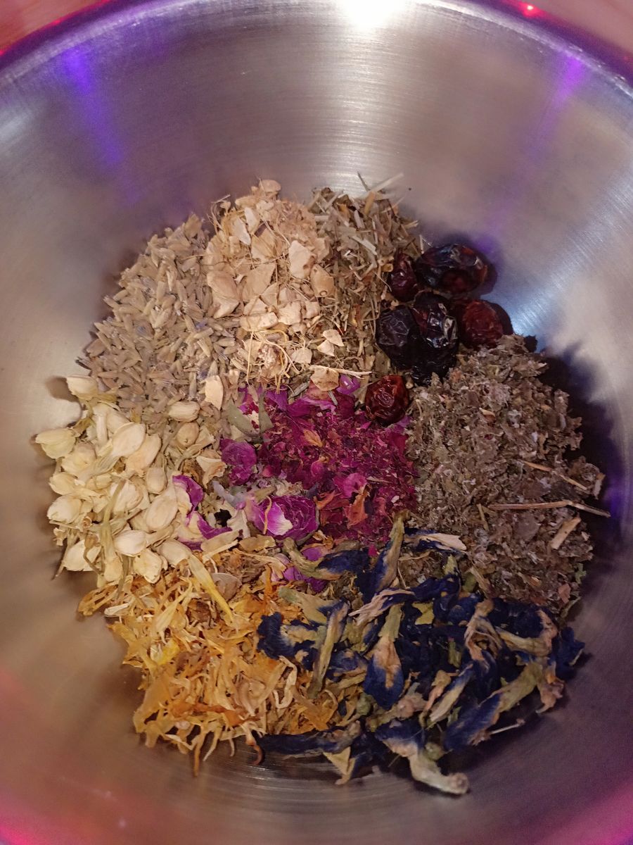 Ingredients: red raspberry leaf, calendula, jasmine, rosebuds, rose petals, lady's Mantle, lavender, wild yam root, butterfly pea flower
